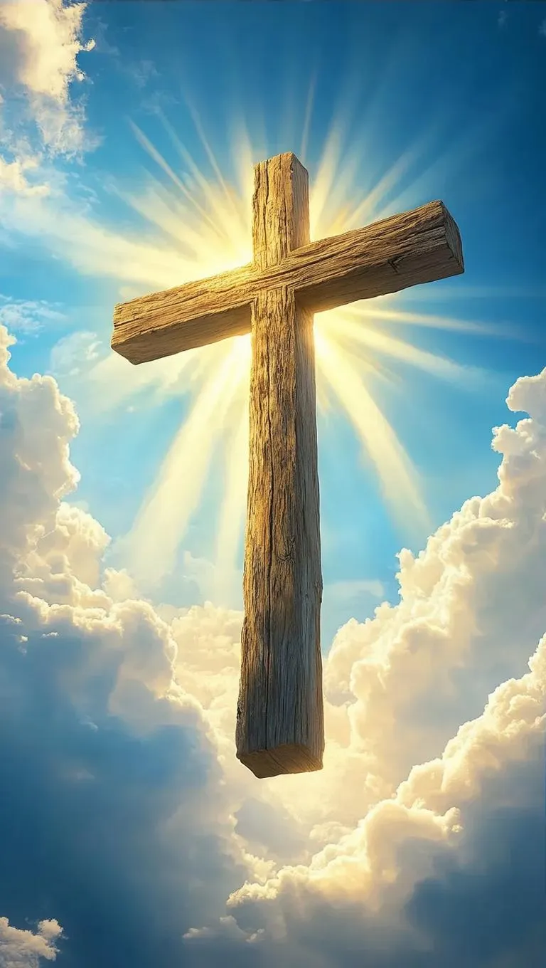 Generate a stunning AI image of a majestic old wooden cross floating in a serene sky. Bathed in radiant sunrays, the weathered cross contrasts with soft clouds and vibrant blue hues, evoking spiritual symbolism. Perfect for divine imagery, religious themes, or inspirational art. Use VivaGo.ai's AI tools for professional-grade visuals.