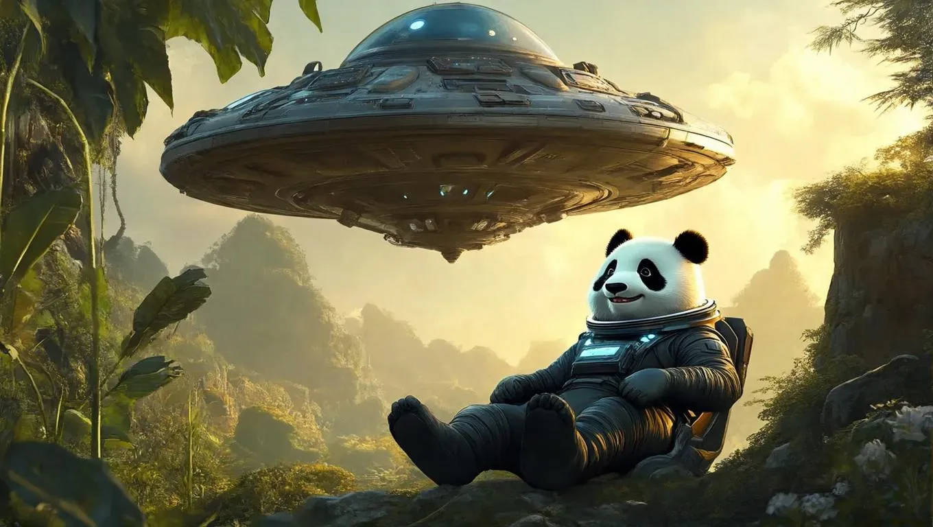 Create an AI-generated image of a playful panda riding a futuristic alien spacecraft, smiling amidst a vibrant sci-fi scene. Transform text prompts into vivid visuals with Vivago.ai's advanced AI image generator and professional editing tools.