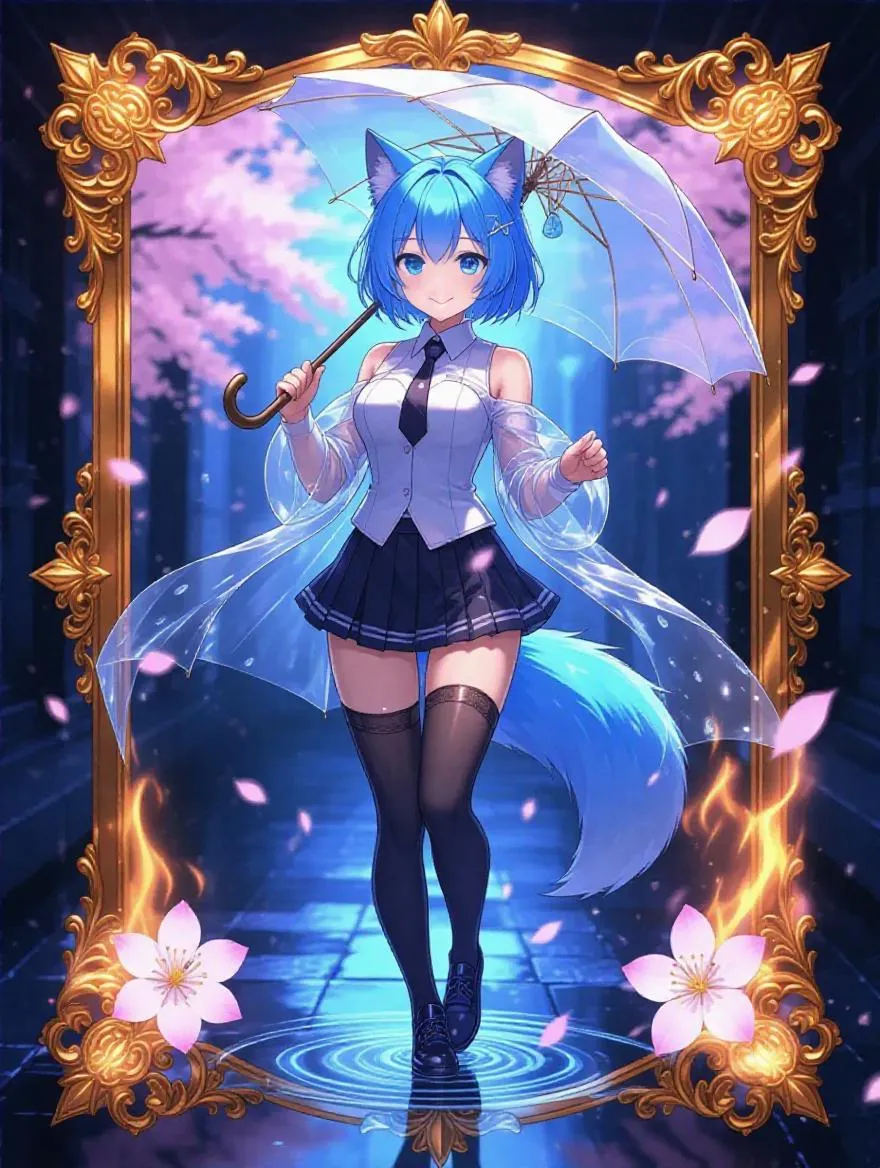A vertical trading card illustration in anime style, featuring a fox girl character with short, sky-blue hair and a transparent raincoat over a sporty uniform, standing confidently inside an ornate fantasy card frame. The frame is adorned with glowing flames, cherry blossoms, and golden ornaments. She smiles as she splashes through puddles, her tail wet and sleek, holding a folded umbrella like a blade. The background glows with soft sparkles, enhancing her water-element vibes. The card has a magical, high-detail look, designed for a game card.