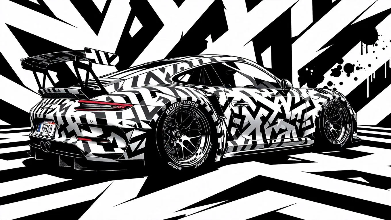 Create a printable line-art coloring page for kids featuring a sleek street-tuned Porsche drift car with geometric graffiti patterns, customizable interior designs, ultra-thin outlines, and a pure white background. Perfect for children's creative activities. AI-generated black-and-white vector illustration for easy printing.
