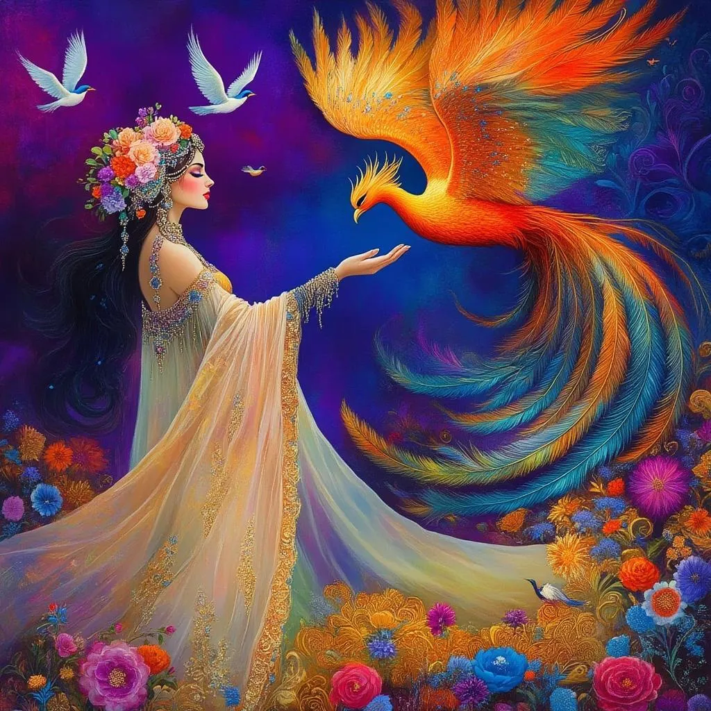 Create mystical Persian-inspired AI art featuring an ethereal woman with a mythical phoenix, vibrant floral patterns, and swirling golden hues. This AI-generated image blends rich textures, deep purples, fiery oranges, and soft blues, capturing spiritual harmony and intricate details in a dreamlike, otherworldly miniature art style.