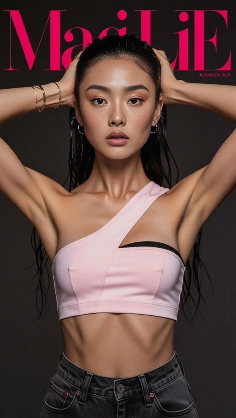 A fashion editorial photograph featuring a Spanish-Japanese female model in an asymmetric pose, with long, tidy, wet, white hair, wearing a simple, elegant, strapless, cropped, pastel pink sport bra and dark gray jeans. Her beautiful, huge, widely spaced eyes stand out as characteristic features of her perfectly proportional, slim, natural, regular face. Paradoxically subtle and elegant, punk-inspired make-up featuring vivid orange shades and piercings enhances her distinctive beauty. Grainy analog photo, with a unique camera angle, captures all intricate skin details under harsh, irregular lighting. Emotionless, neutral expression. Slim, proportional body.