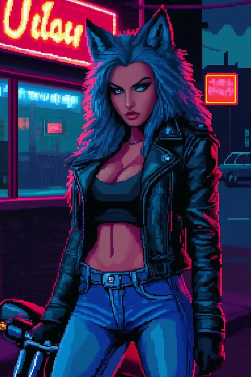 Generate retro pixel art of a female werewolf biker in blue jeans and leather jacket, standing outside a neon-lit bar at night. AI-powered pixel art tool creates classic video game-style visuals for edgy, nostalgic character designs. Perfect for gamers, digital artists, and retro enthusiasts seeking dynamic AI-generated fantasy scenes.