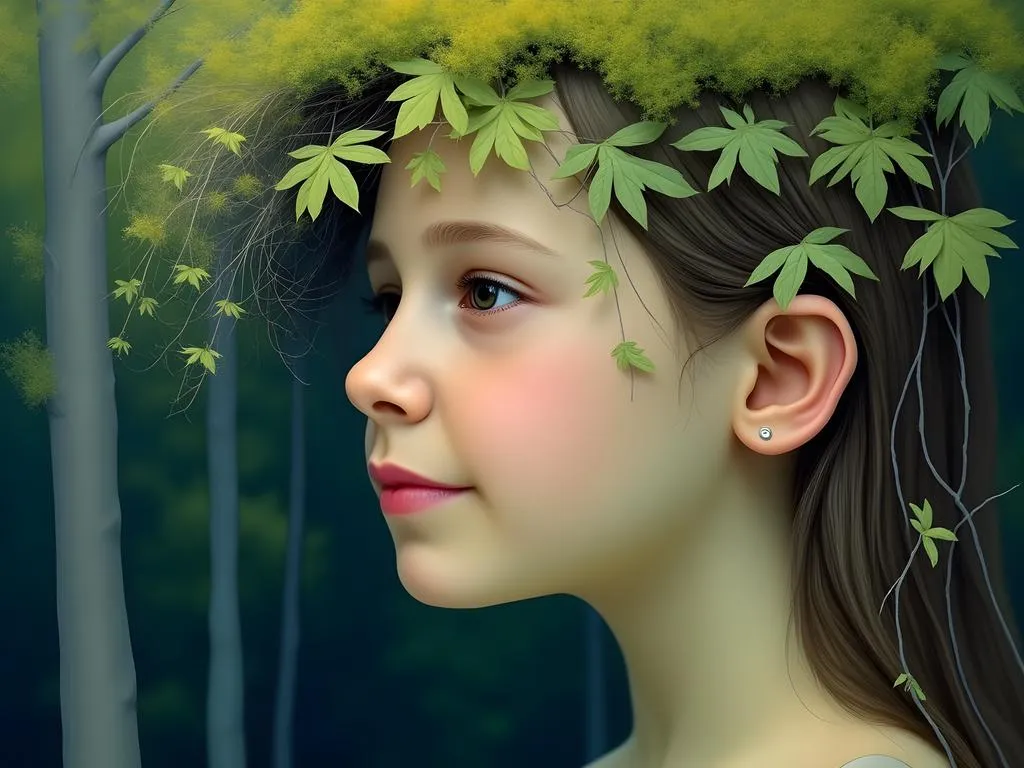 Create surreal AI art blending feminine beauty with enchanted forests using VivaGo.ai. Generate vibrant nature-portrait fusions where flowing hair becomes lush foliage, with rich green-blue-yellow palettes and intricate leaf textures for mesmerizing human-landscape harmony in AI-powered visual storytelling.