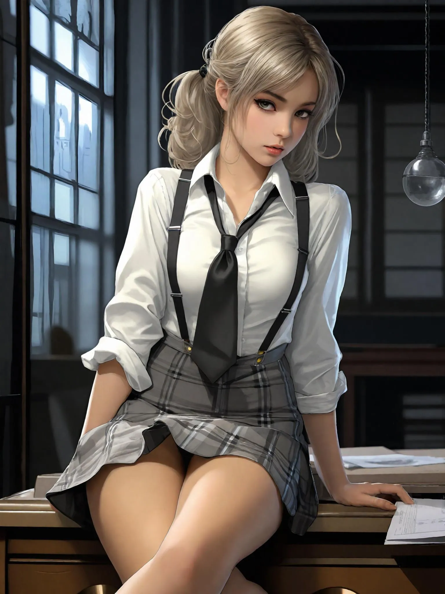 full view sexy anime female detective. She is wearing a crisp white dress shirt paired with a grey plaid mini skirt, which is held up by classic suspenders. On her feet are stylish black heels. She strikes a thoughtful pose, resting her hand under her chin as if deep in contemplation. Her expression is sharp and observant. The setting has a mysterious atmosphere, perhaps in an old study or a dimly lit room. Full body shot, cinematic style, storytelling mood.