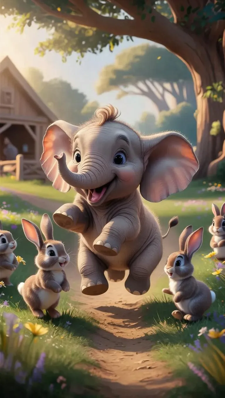 Create a heartwarming 3D Pixar-style scene with a playful baby elephant mimicking bunnies on a whimsical farm. AI-generated animation brings vibrant wildflowers, towering oaks, and lively character interactions to life. Perfect for storytelling or charming visuals, blending professional-grade AI tools with vibrant, family-friendly details.