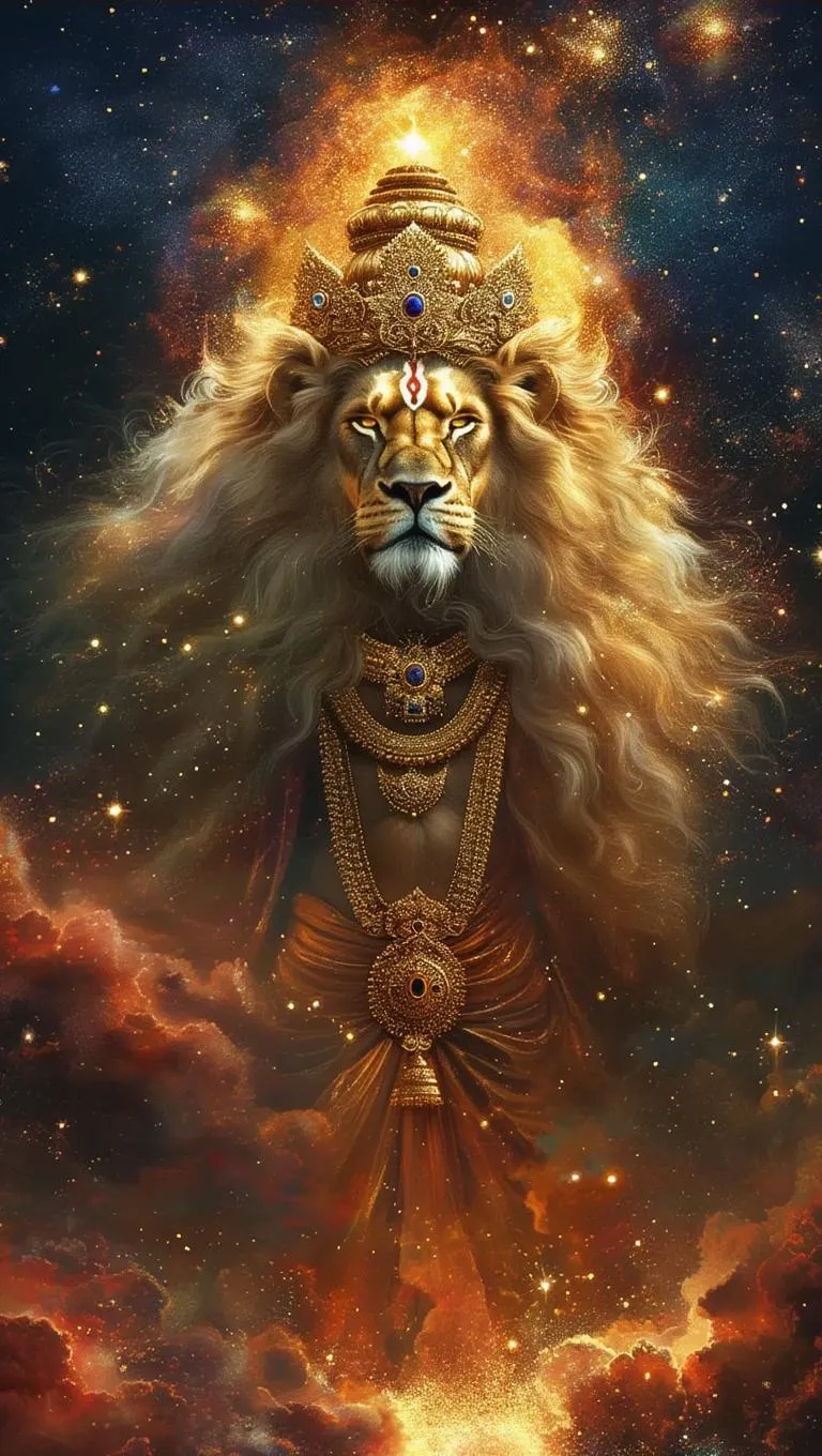 Generate stunning AI art of Lord Vishnu's fierce Narasimha avatar as cosmic lion deity, blending majestic gold accents, celestial stars, fiery galaxies, and divine fantasy elements. Transform text prompts into vibrant visuals with VivaGo's AI tools for epic mythological imagery and spiritual digital artwork.