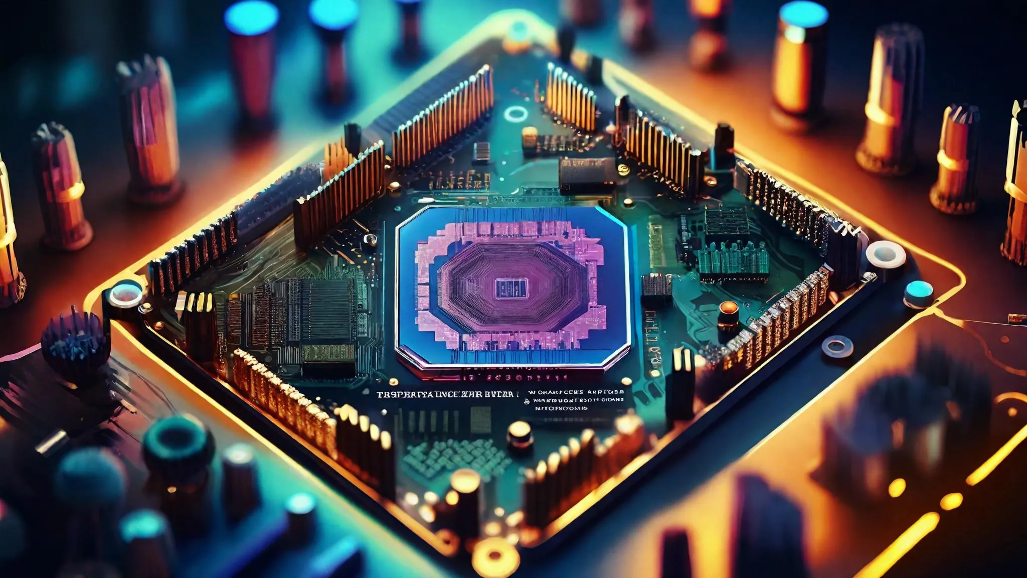 Generate ultra-detailed VLSI design visuals for chip fabrication with AI. Create dense, component-rich integrated circuit board layouts optimized for semiconductor engineering—ideal for professionals seeking precision, complexity, and innovation in AI-generated fabrication blueprints or technical presentations.
