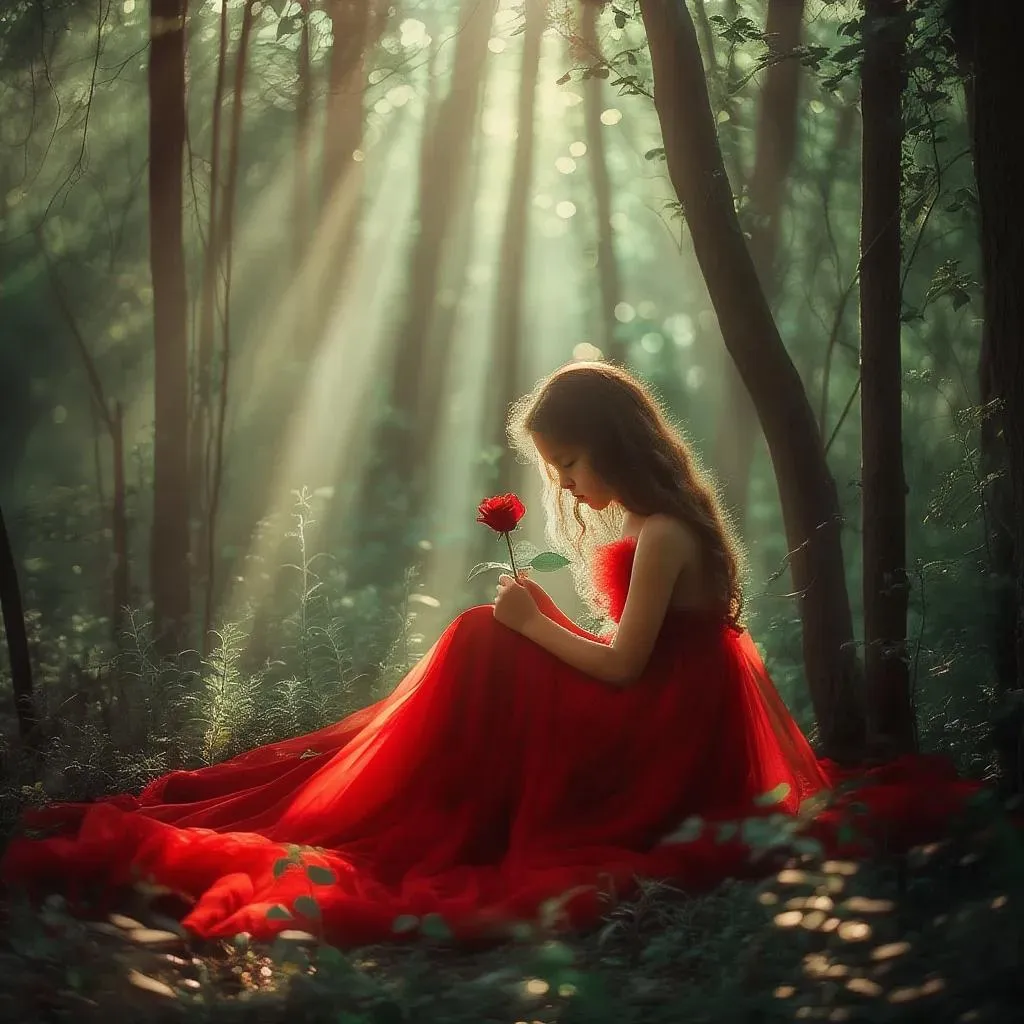 Generate a poignant AI image of a sad girl in a red dress sitting alone in mystical woods, clutching a crimson rose. Vivago.ai transforms emotional text prompts into striking visuals using advanced AI effects, perfect for storytelling or artistic projects. Create professional-grade imagery with mood-driven details and atmospheric depth effortlessly.