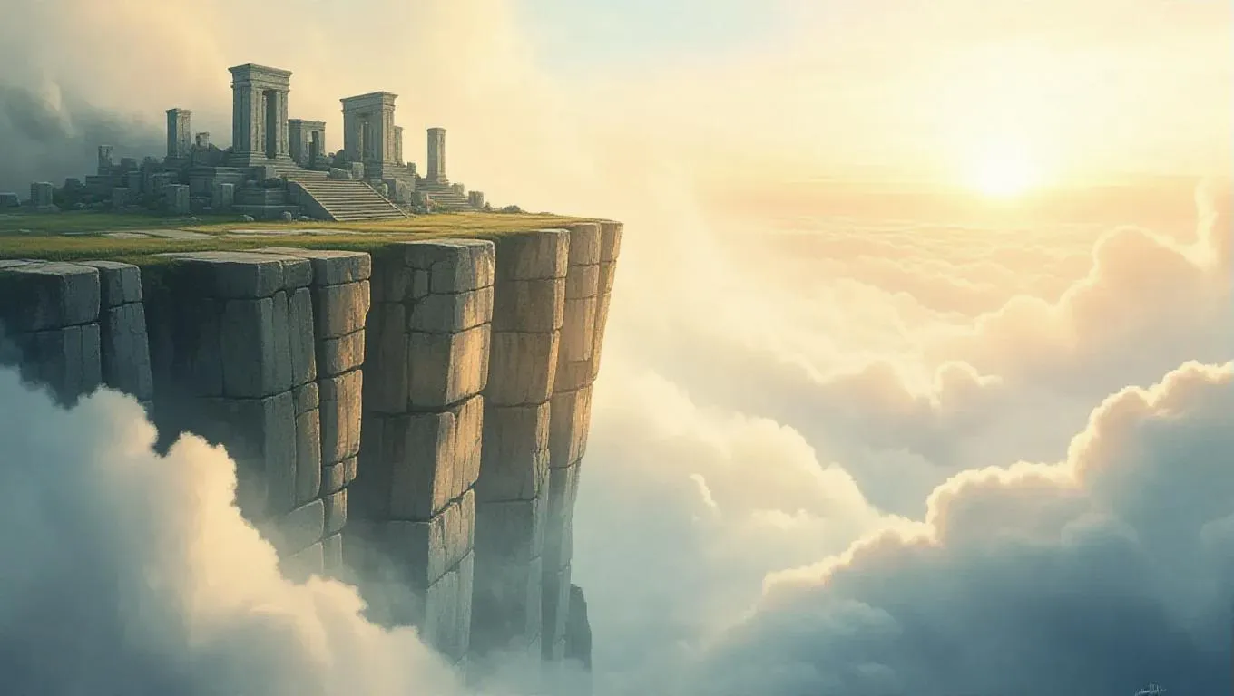 Create a serene, ethereal watercolor painting of a majestic plateau with ancient floating stone ruins. Soft diffused light, aerial perspective, and misty clouds evoke a dreamlike sky city ambiance. Ideal for peaceful, otherworldly AI-generated imagery.