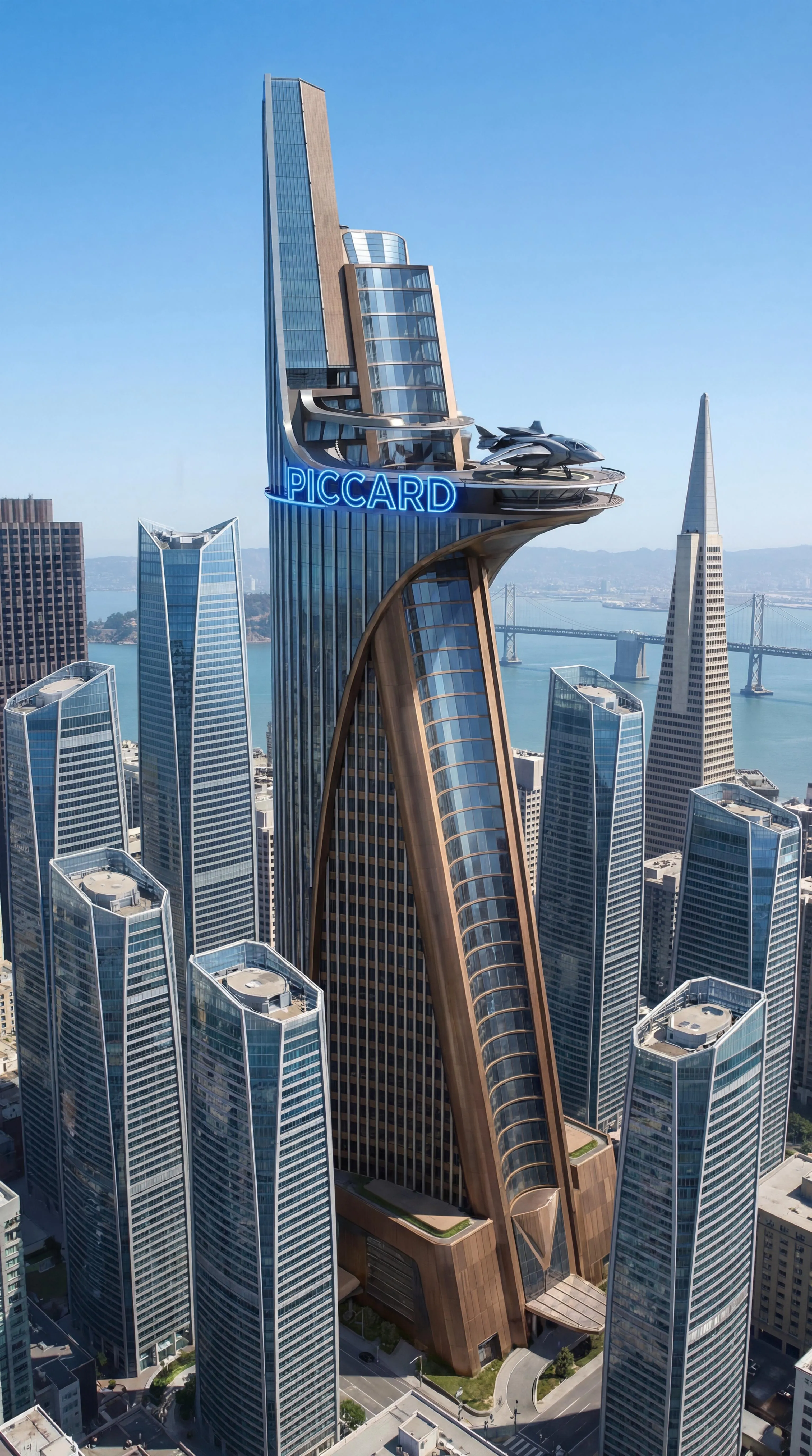 Discover the Piccard Watchtower Complex in San Francisco! This hybrid skyscraper merges MCU's iconic Avengers Tower and Stark Tower. Features distinct Quinjet pads, Iron Man landing platforms, and a towering 104-story main building surrounded by eight others. Sleek, futuristic architecture crowned with a prominent "Piccard" neon sign. Explore AI-generated Marvel-inspired cityscapes.