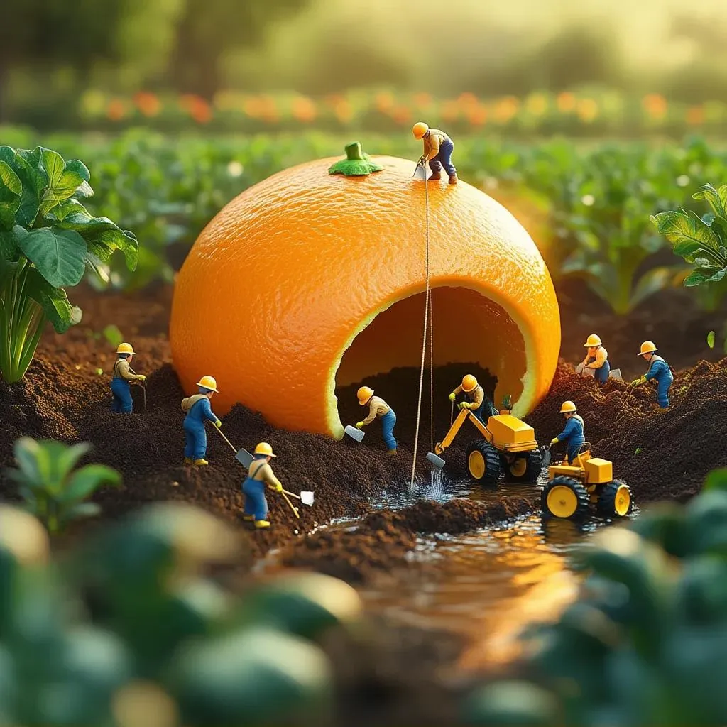 Create a magical AI-generated image of a giant orange excavated by tiny farmers in lush farmland. Cinematic scene features miniature tools, soft golden sunlight, and vibrant crops for enchanting, professional-grade creative visuals.