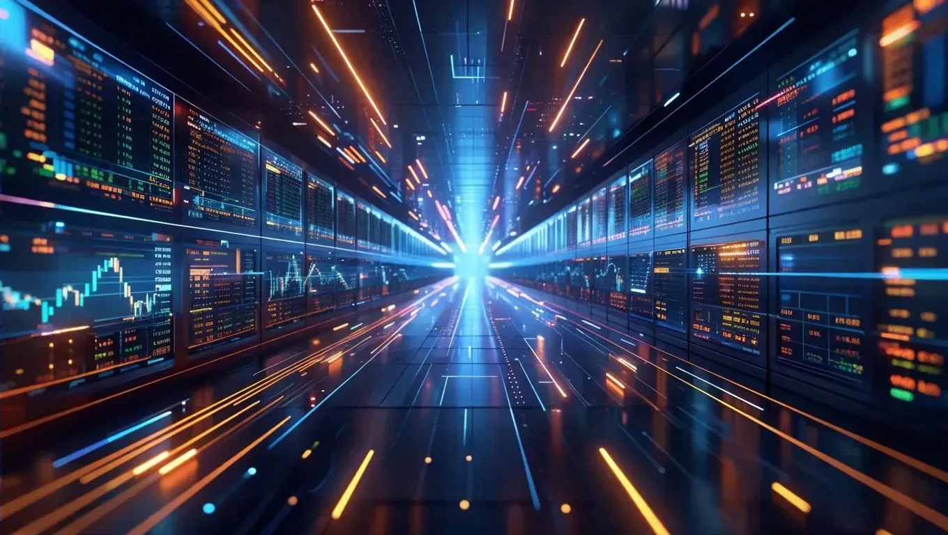 Generate cinematic 3D HD visuals of high-speed AI algorithmic trading with Vivago.ai. Showcase complex AI processes, instant order execution, and futuristic fintech environments in hyper-realistic detail for professional stock market simulations.