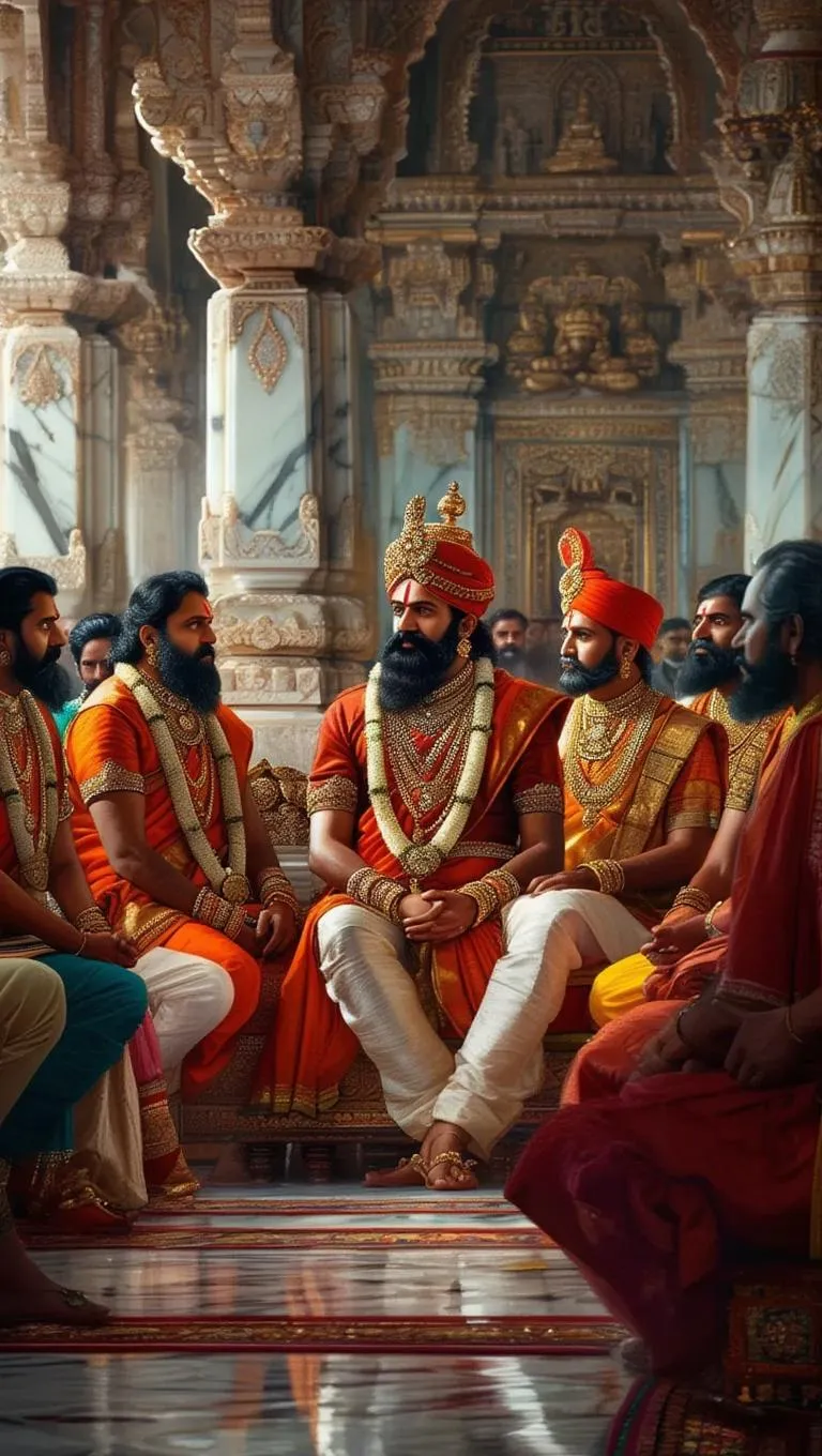 Generate a vivid AI depiction of Shivaji Maharaj's just rule, showcasing the Maratha king attentively engaging with citizens in his royal court. Highlight traditional attire, administrative fairness, and historical grandeur through AI-powered artistry for immersive cultural storytelling and professional-grade visual narratives.
