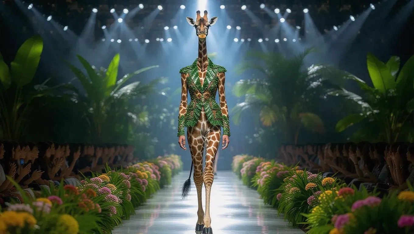 Transform your vision into AI art with this exotic giraffe in a leaf-inspired suit, strutting a nature-themed runway. Detailed hooves, vibrant lighting, and cheering crowds captured in professional-grade AI-generated visuals. Explore creative AI effects for wildlife fashion and dynamic runway photography. Elevate your projects with Vivago.ai’s cutting-edge tools.