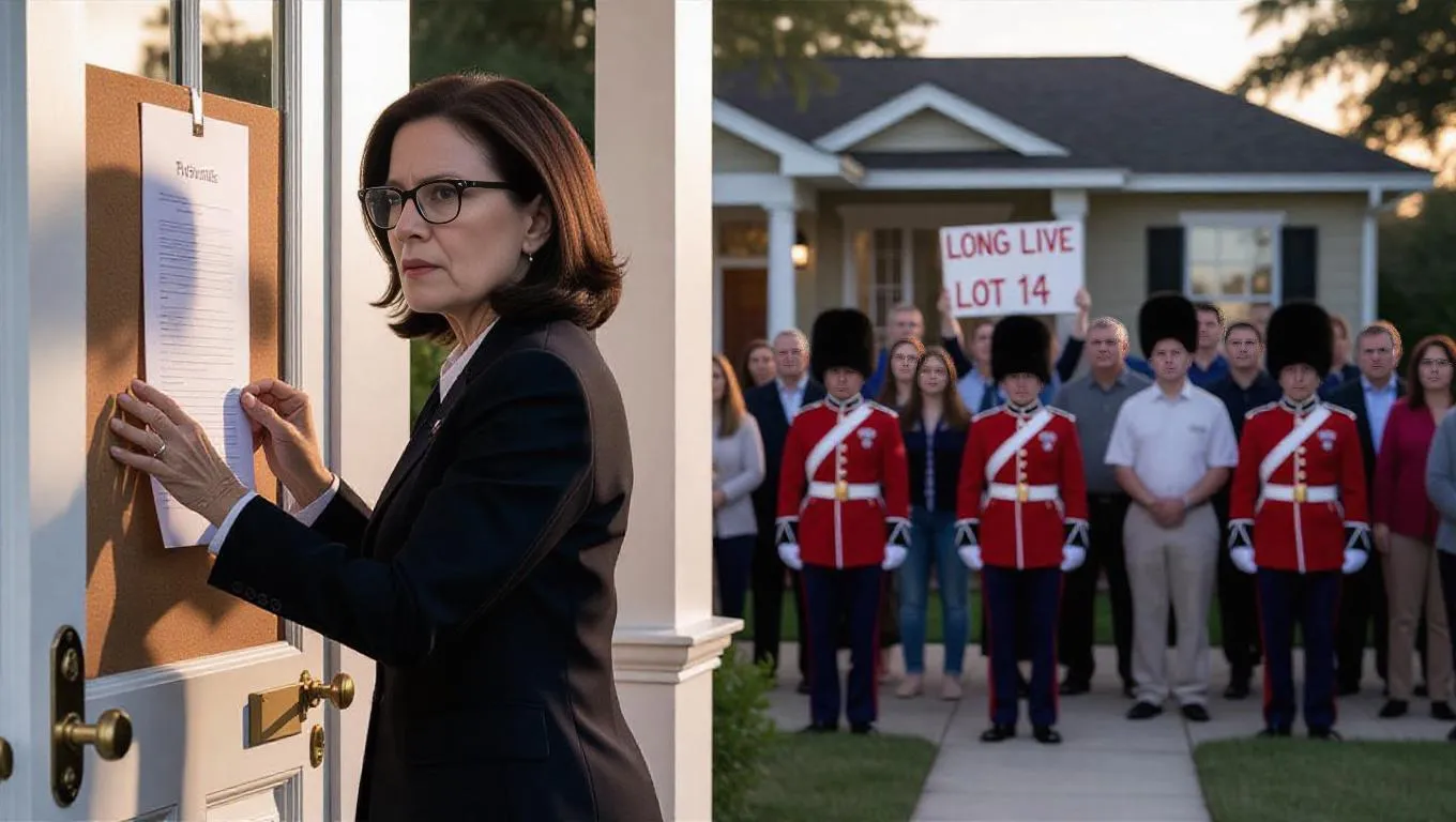 Generate realistic 16:9 AI images with dramatic storytelling: a resigned "HOA Karen" pins her letter amid a silent crowd, symbolic Royal Guard, and "Long Live Lot 14" sign. Soft sunset lighting enhances reflective, triumphant tones. Perfect for cinematic visuals and emotional depth. Powered by vivago.ai's AI image generator for professional-grade creative results.