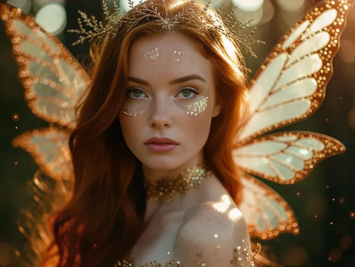 Create enchanting AI-generated fairy photography with vivago.ai. Visualize a red-haired, green-eyed fairy with glittering wings and golden details in a mystical forest. Soft sunset light, shadowy trees, floating sparkles, and magical ambiance crafted through AI artistry. Ideal for fantasy visuals, ethereal storytelling, and professional-grade mythical imagery.