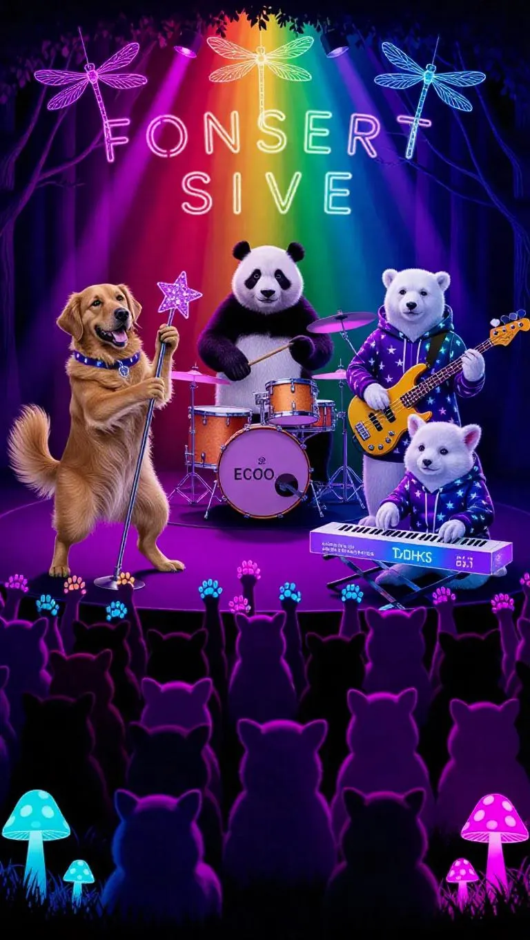 Vibrant AI-generated image of a whimsical neon forest concert with anthropomorphic animal musicians. Golden retriever singer, panda drummer, nine-tailed fox guitarist, polar bear bassist, and levitating chinchilla keyboardist perform under bioluminescent mushrooms and dragonfly-wing canopy. Features glowing fur textures, LED instruments, holographic elements, and an animated animal audience waving luminous paws. Perfect for showcasing AI creativity in magical, hyper-detailed visual storytelling.