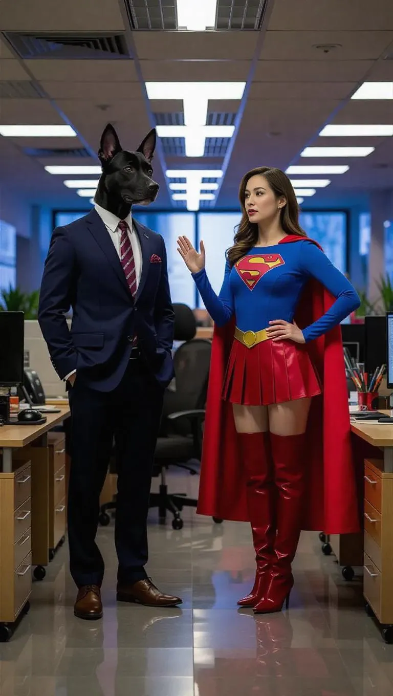 360度全景全室角辦公室身穿西裝小黑狗頭人身全身鏡頭外觀西裝小黑狗人男老闆 跟1位全身鏡頭完整外觀身穿紅藍色相間氪綸纖維緊身衣制服胸口印有菱型盾牌超人大大S標誌 背後掛上披上紅色漆皮長披風下身紅色短裙 雙腳穿上紅色高筒長靴中國年齡28歲女老闆女超人談生意打電話显示完整版全身镜头外观双腿双腿中间留缝隙两脚分开两脚外沿宽度以不超过两肩的宽度为宜站立姿勢