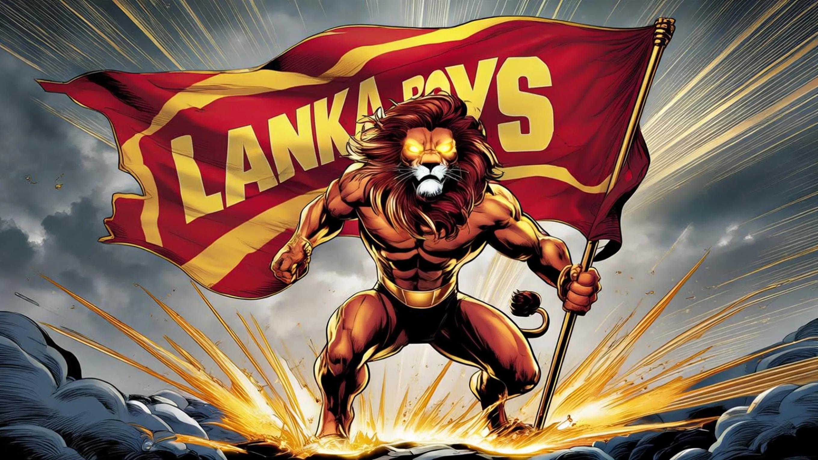 Create epic Marvel-style comic book art with AI. Generate powerful lion mascots in heroic poses holding flags, featuring bold red/gold colors, glowing eyes, dramatic manes, and stormy cinematic backgrounds. Ideal for Sri Lanka-inspired heroic character designs with dynamic shading, motion effects, and ultra-sharp 4K resolution comic covers.