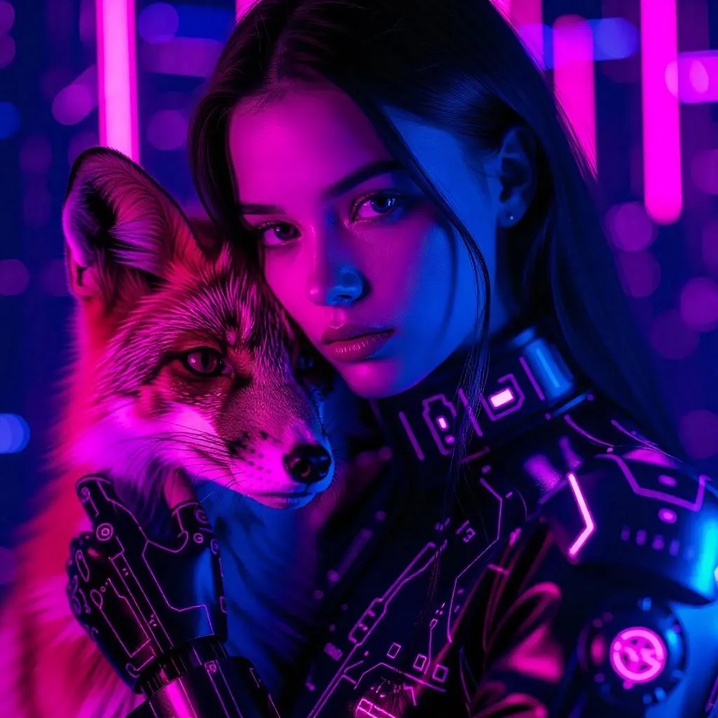 hdistyle, art illustration, 1 girl, android girl, holding a robotic fox, neon circuitry, deep cyber blue and purple lighting, futuristic pet bonding, holographic interface overlay, masterpiece, best quality, ultra-detailed eyes, pink neon cybercore, highly aesthetic, absurdres, cutting-edge technology, vibrant atmosphere