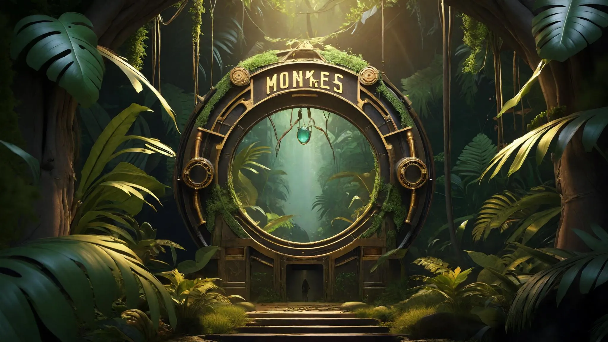 Generate a steampunk game-style magical jungle portal featuring "THE 3 WILD MONKEYS" inscription with AI. Craft intricate gears, mystical vines, and glowing runes using vivago.ai's tools for immersive fantasy adventure visuals. Perfect for game art, book covers, or surreal AI-generated worlds blending mechanical details and wild jungle mystique.