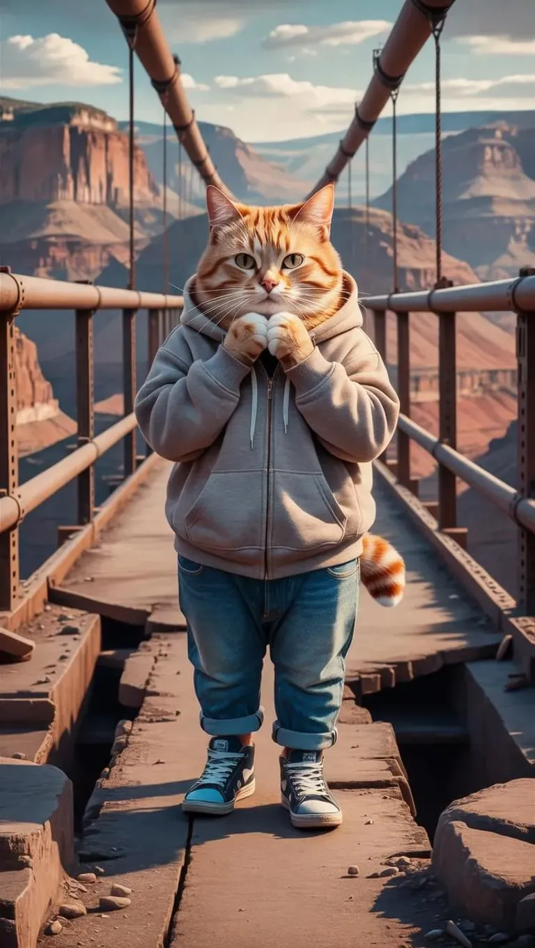Generate a whimsical AI image of a chubby orange tabby cat in a hoodie and jeans, pacing thoughtfully on a broken bridge. Vivago.ai transforms text prompts into vivid visuals with sunny canyons, rocky cliffs, and dynamic effects for creative projects. Experience professional-grade AI image generation.