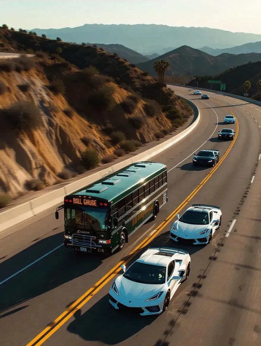 Create a high-speed chase AI image: penitentiary green bus pursued by a black Lamborghini Gallardo and three white police Chevy Corvettes on a desert highway near Los Angeles hills. 4K HD hot pursuit scene generated from text prompts with professional AI visual effects.