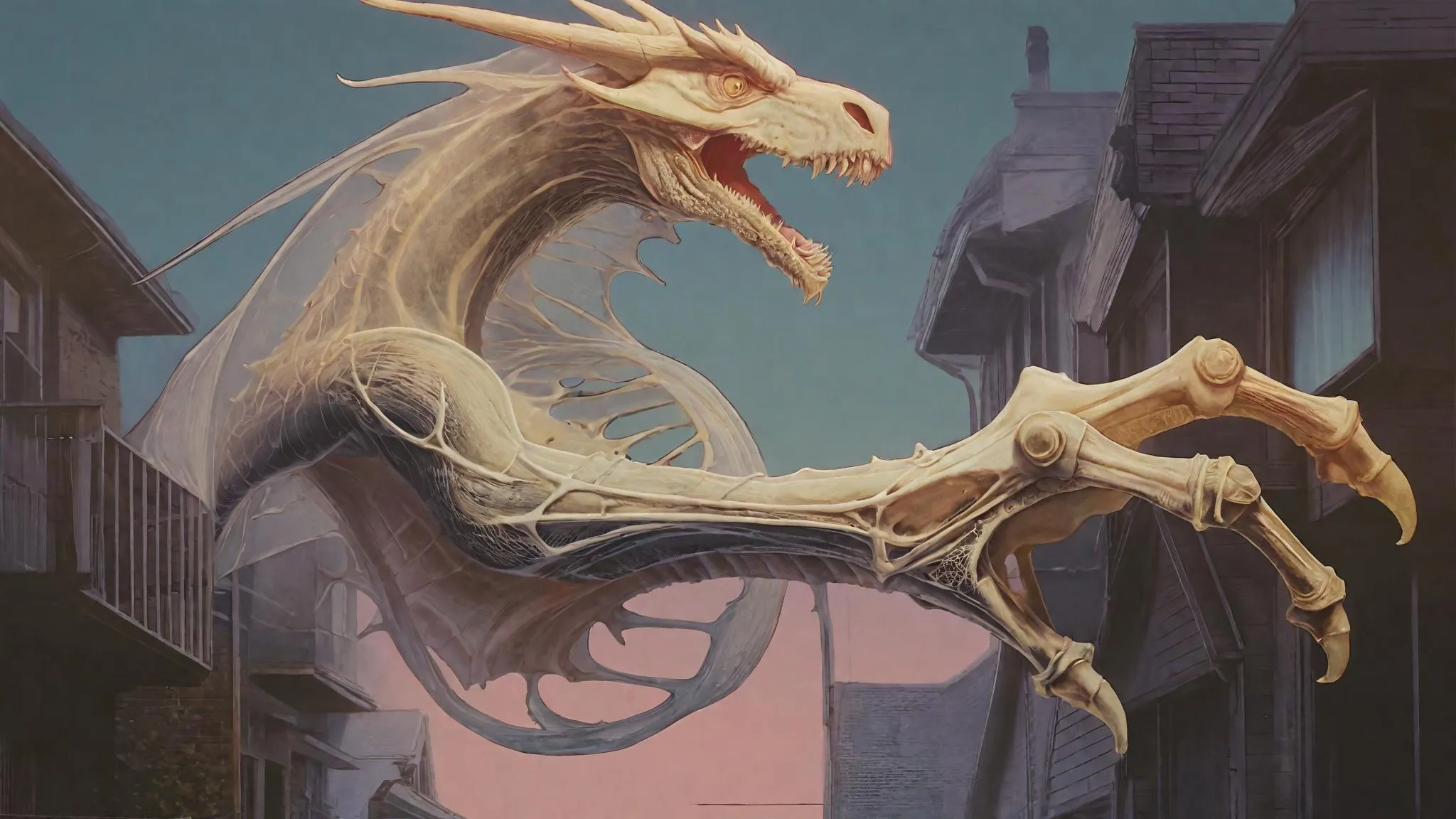 Ethereal dragon with translucent bones and shimmering skin glows softly in an 80s suburban backdrop. High-detail AI art merges surreal fantasy with retro cinematography, muted colors, and intricate textures. Combines mythical creatures, nostalgic 1980s photography, and large-format visuals for a surreal, cinematic masterpiece.