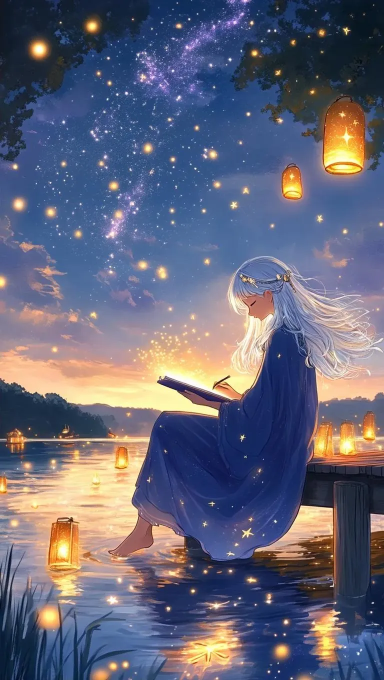 Craft enchanting AI-generated anime art with Vivago.ai. Visualize a starlit lakeside dusk featuring a celestial traveler, glowing constellations, and Ghibli-inspired watercolor scenery. Generate serene summer nights, luminous fireflies, and nostalgic fantasy atmospheres effortlessly. Perfect for cinematic, dreamy visuals with celestial accents. Transform your vision into mesmerizing anime-style artwork.