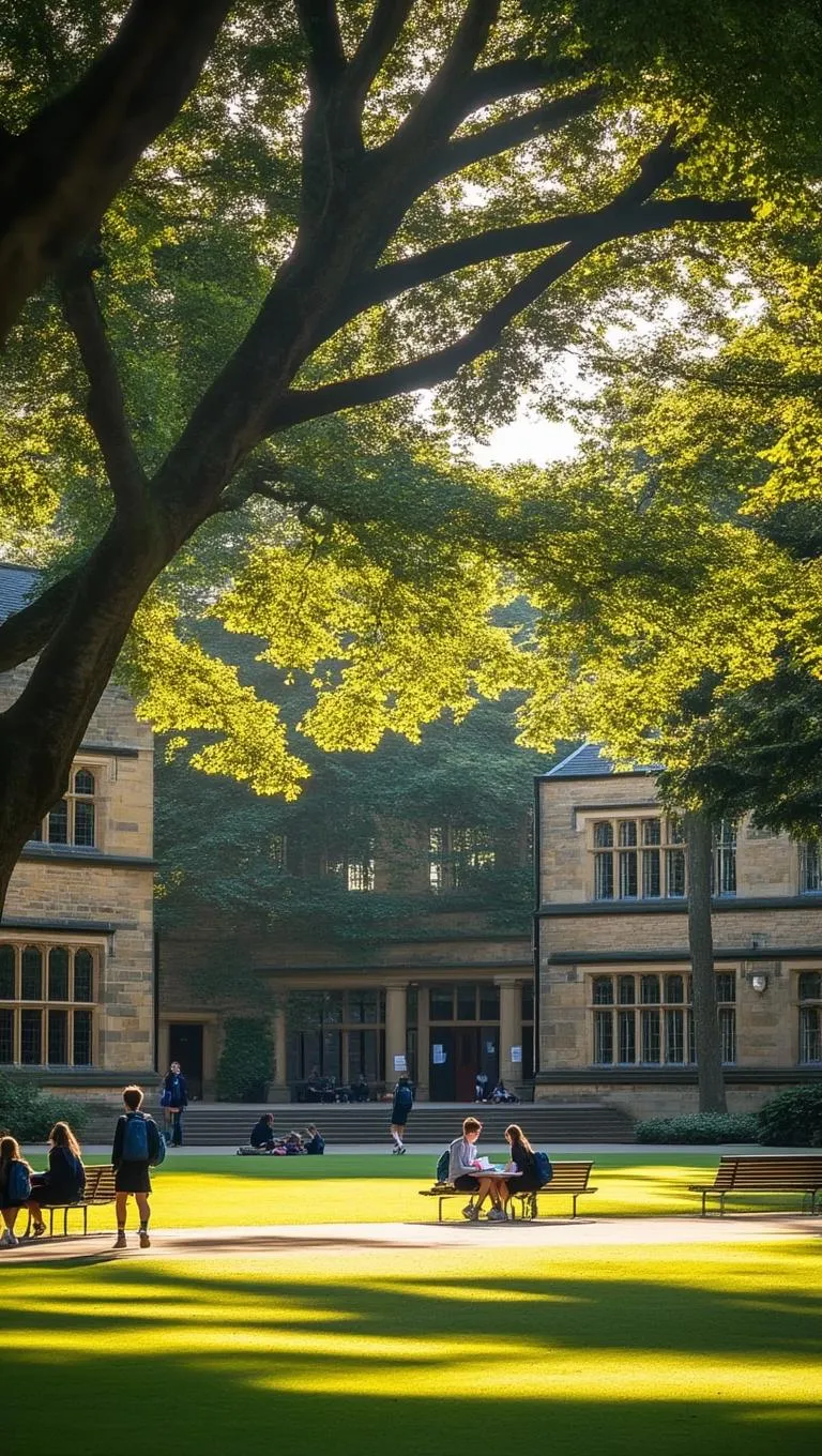Capture a serene late morning school quad scene with AI. Sunlight filters through leafy trees, casting dappled shadows on manicured grass. Students stroll or relax amidst classic stone and modern glass buildings. Peaceful ambiance with birdsong and rustling leaves, blending prestige and tranquility. Perfect for academic visuals or storytelling with subtle underlying stillness.