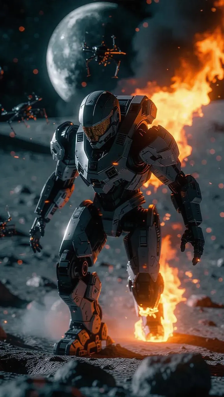 An advanced robotic warrior in a mechanical exoskeleton suddenly bursts into flames while engaging a swarm of vicious drone attackers on a deserted moon, the fire consuming their body, the scene illuminated by the moon's shimmering surface.