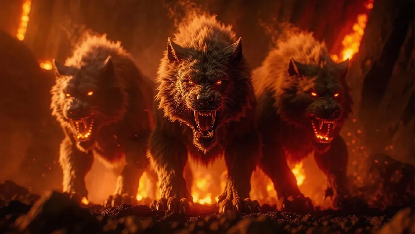 A behemoth three-headed Cerberus with fur made of raging flames, each head spewing fire against the backdrop of volcanic rock in the underworld, intense lighting, hyper-realistic textures