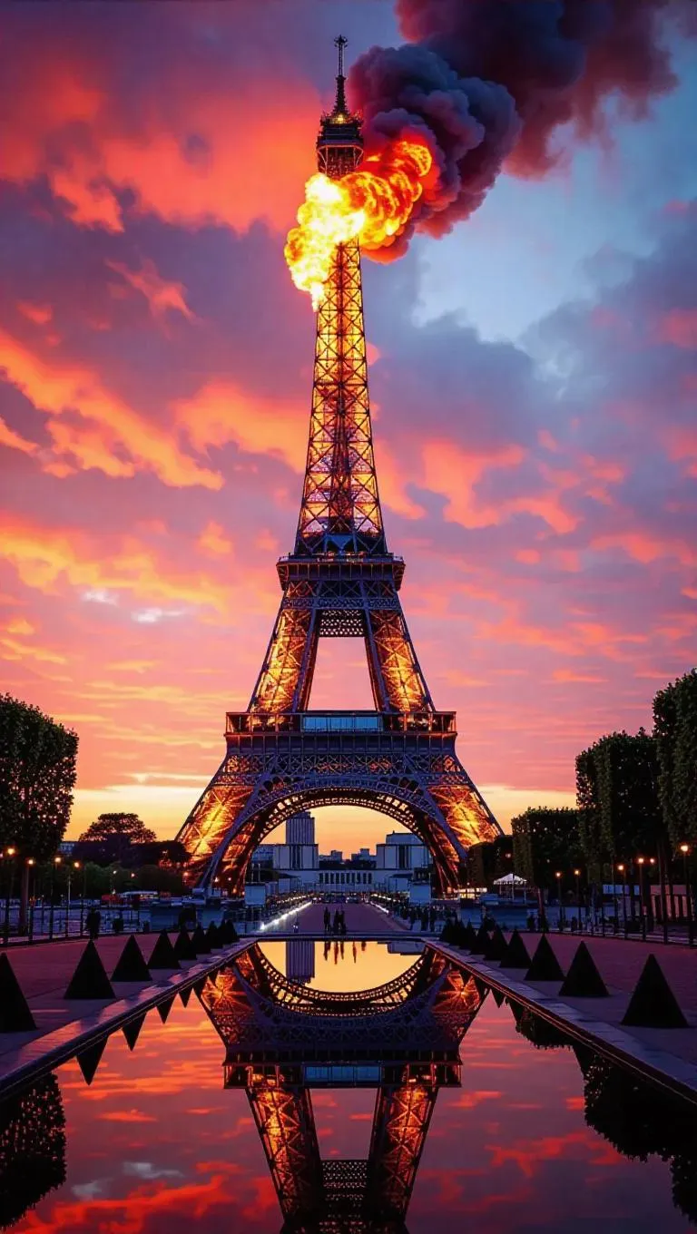 Eiffel Tower transformed into kilometer-tall gas burner, Art Nouveau ironwork glowing like particle accelerator diagrams. Parisian streets flooded with liquid fire reflecting impressionist brushstroke skies."