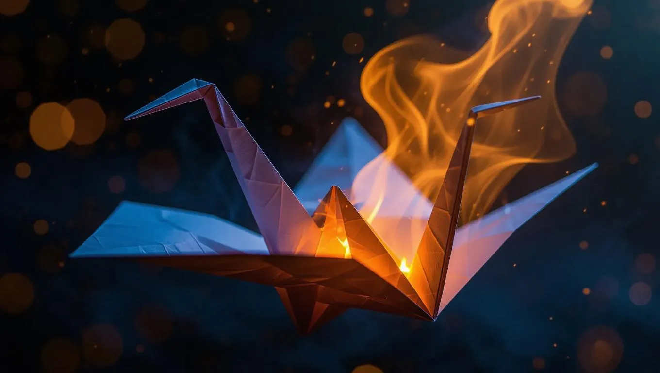 A delicate paper crane floating in the air, its edges slowly catching fire, glowing embers drifting away, soft blue light, serene atmosphere, ultra-detailed