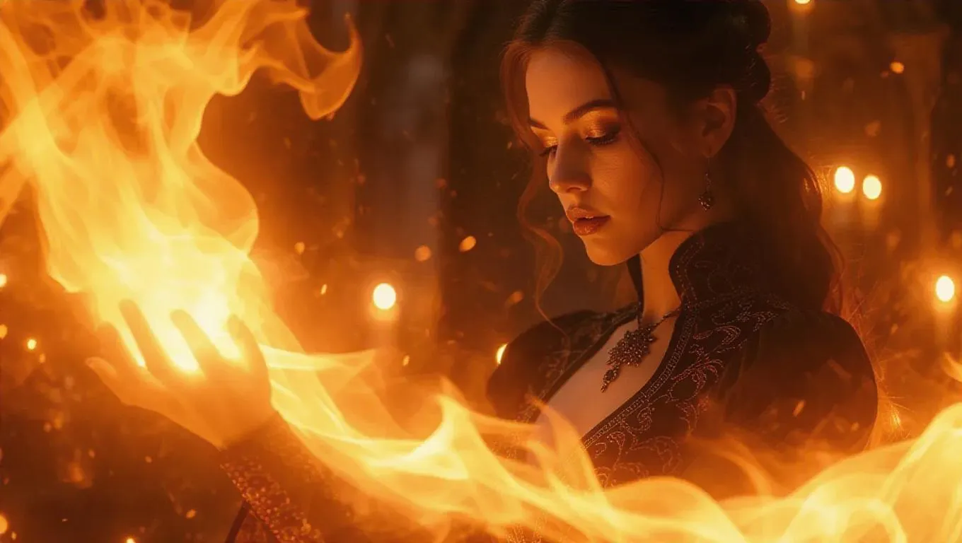 An elegant sorceress summoning fire magic, swirling flames forming ornate patterns around her, radiant lighting, fantasy elegance, ultra-HD.