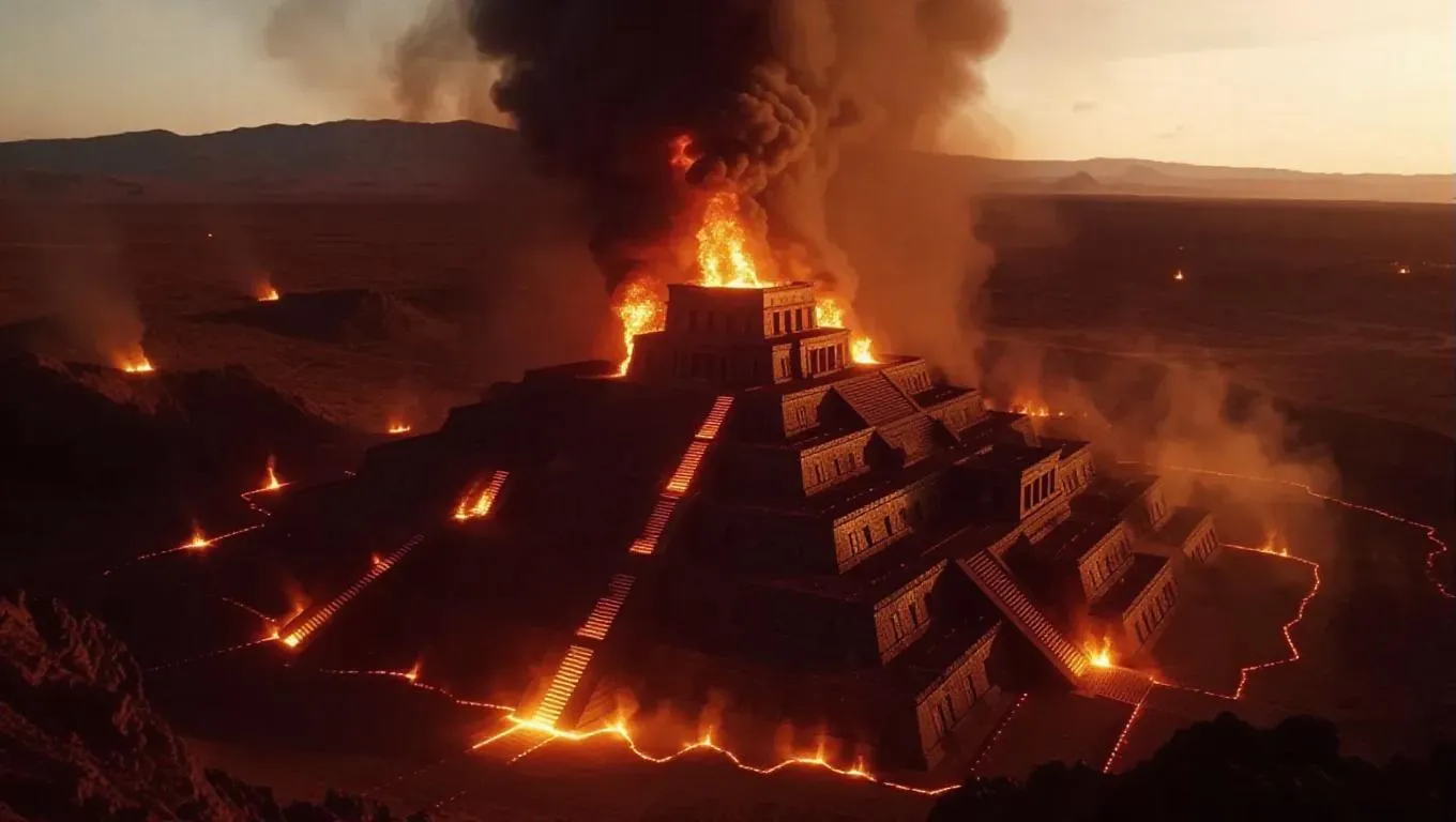 AI archaeologists demonstrating Atlantis from volcanic ash projections, each eruption illustrating the city's collapse into blazing fire. Lidar-captured architecture enhanced with modern graffiti flames.