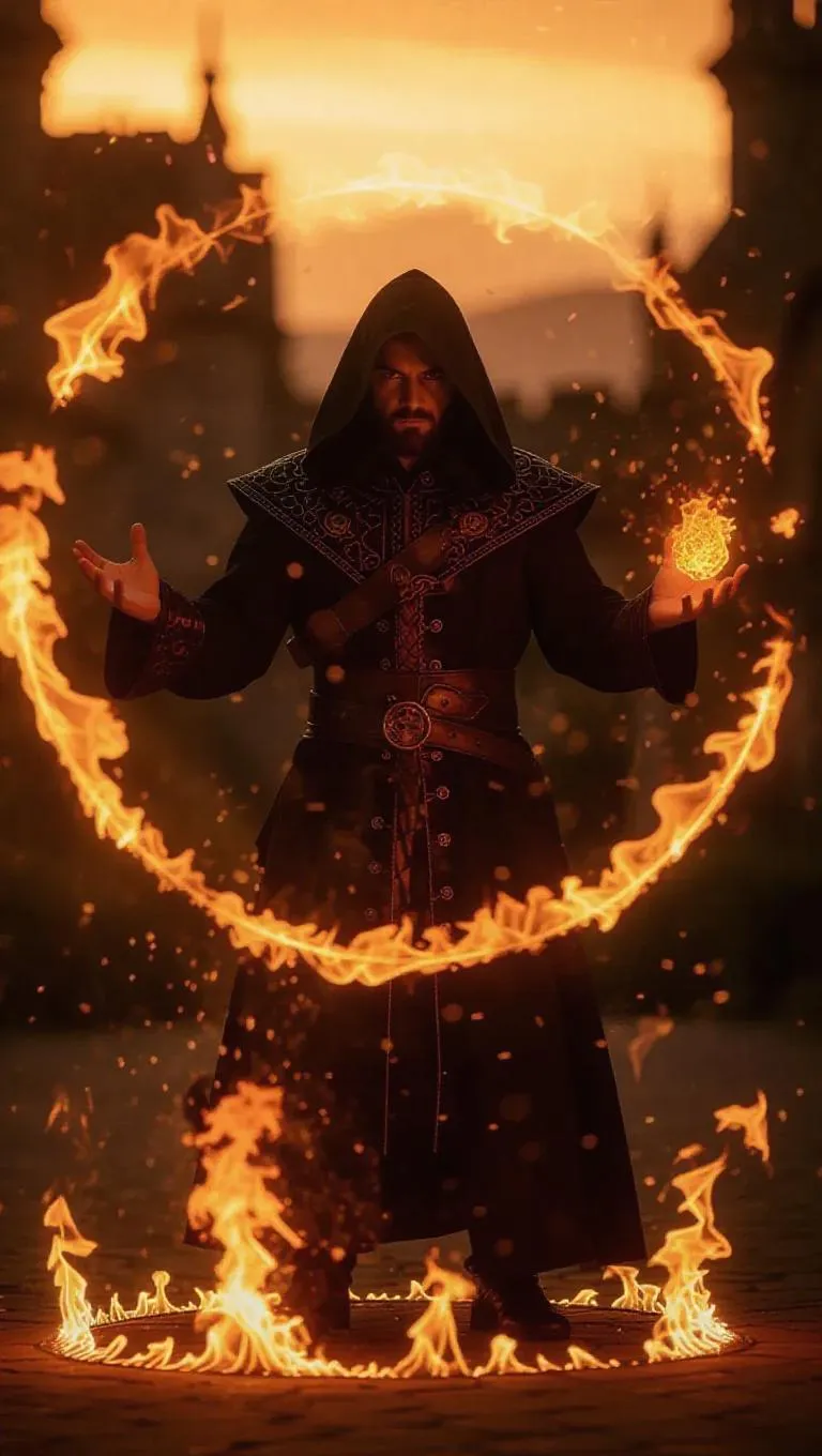 A fire mage stands during a sunset, surrounded by a ring of fire that keeps enemies at bay, the mage's hands glowing with magical flames, as he prepares to unleash a devastating fireball.