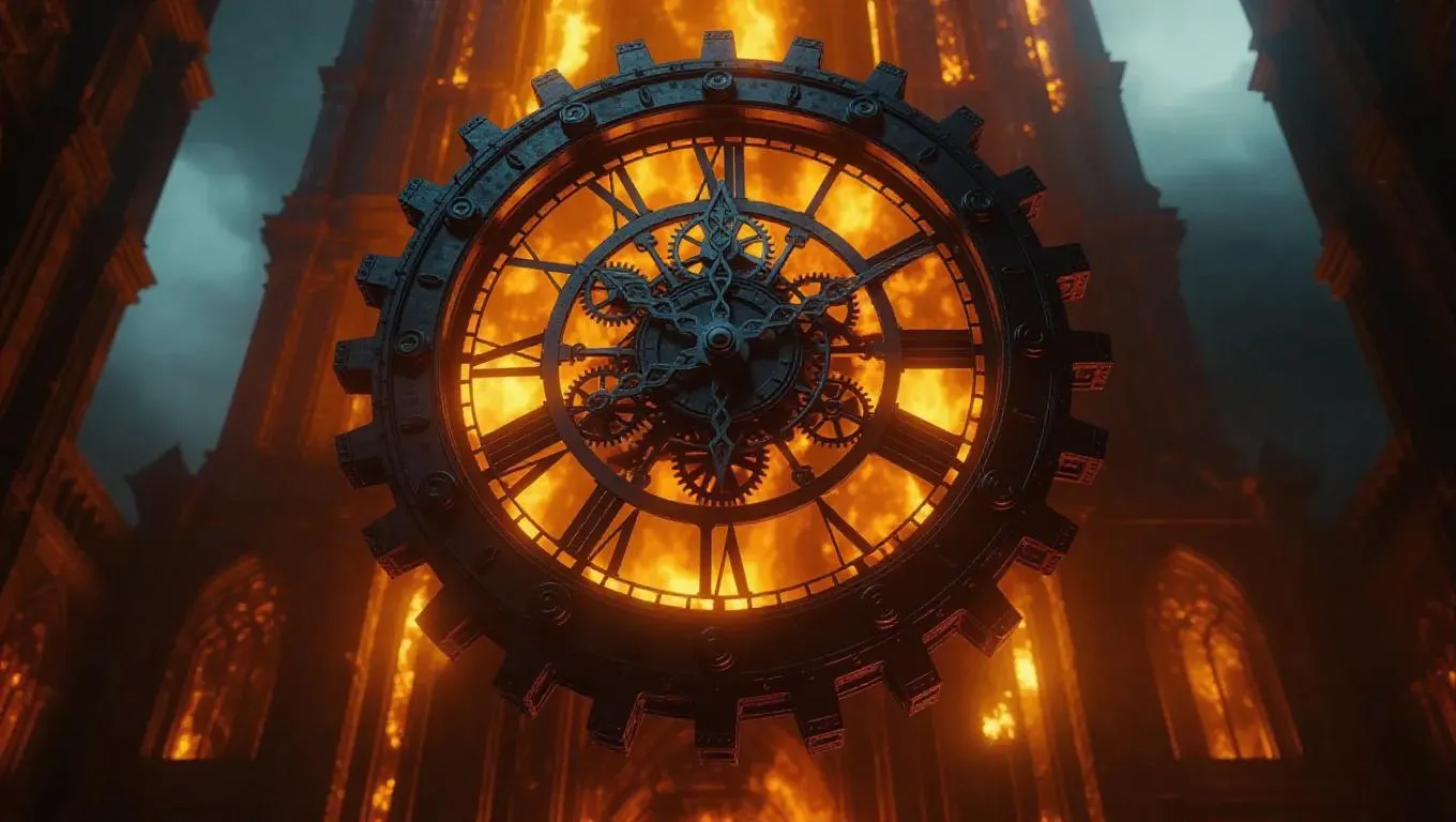 A colossal ancient clock tower in the center of roaring fire, gears and cogs melting, retro-futuristic aesthetics, dramatic lighting, ultra-detailed.