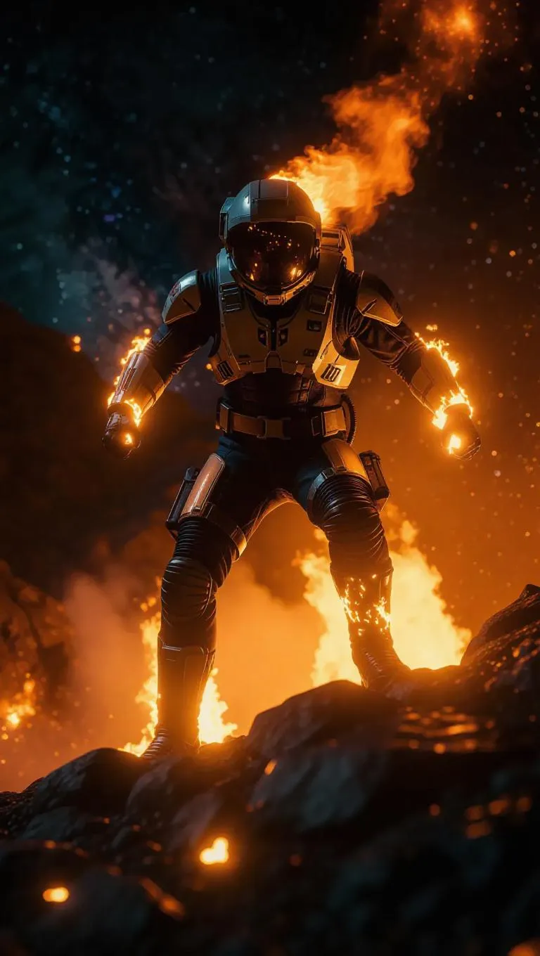 A space adventurer in a stylish flight suit suddenly bursts into flames while dueling a fearsome alien overlord on a rocky terrain, the fire consuming their body, the scene illuminated by the distant stars.