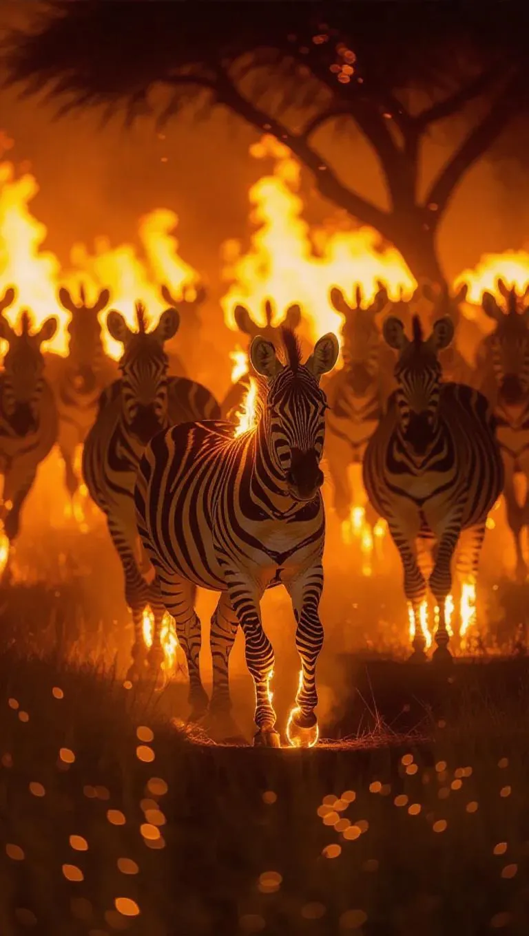 Migrating zebra herd aflame across savanna, golden fire ripples mimicking grass waves. Burning hooves leave phosphorescent fungal spores, night vision documentary aesthetic.