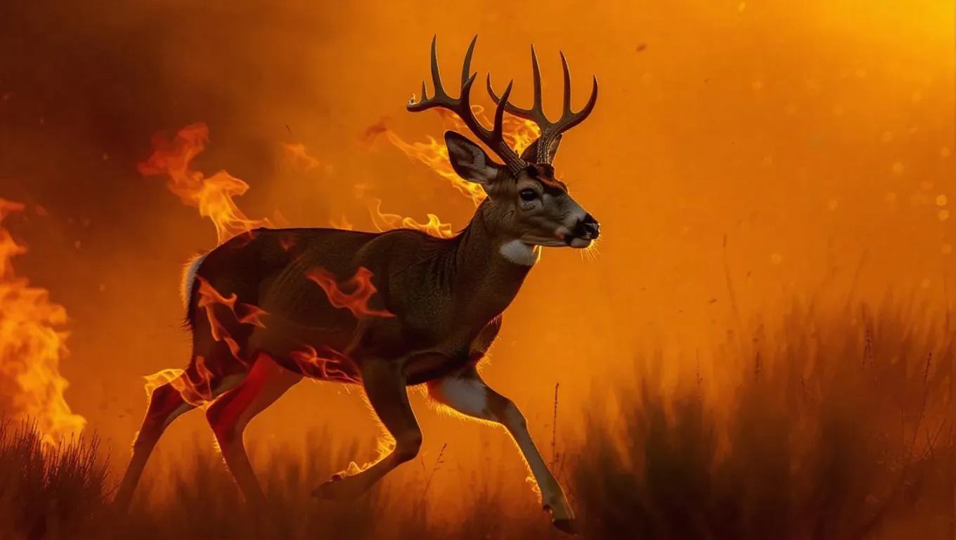 a startled mule deer fleeing a California wildfire, its hindquarters engulfed in licking amber flames. Use a Phantom Flex 4K at 500fps to capture individual hairs igniting and curling upward. Dynamic inferno lighting casts shifting shadows across its contorted face, with fire reflections shimmering in dilated pupils. Billowing smoke filters golden-hour sunlight into a blood-orange haze