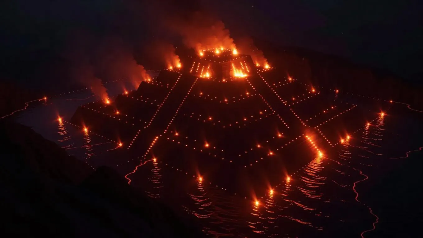 AI archaeologists revealing Atlantis using volcanic ash mappings, each eruption detailing the city's last moments in flickering flames. Lidar-focused landmarks blended with dark wave flames.