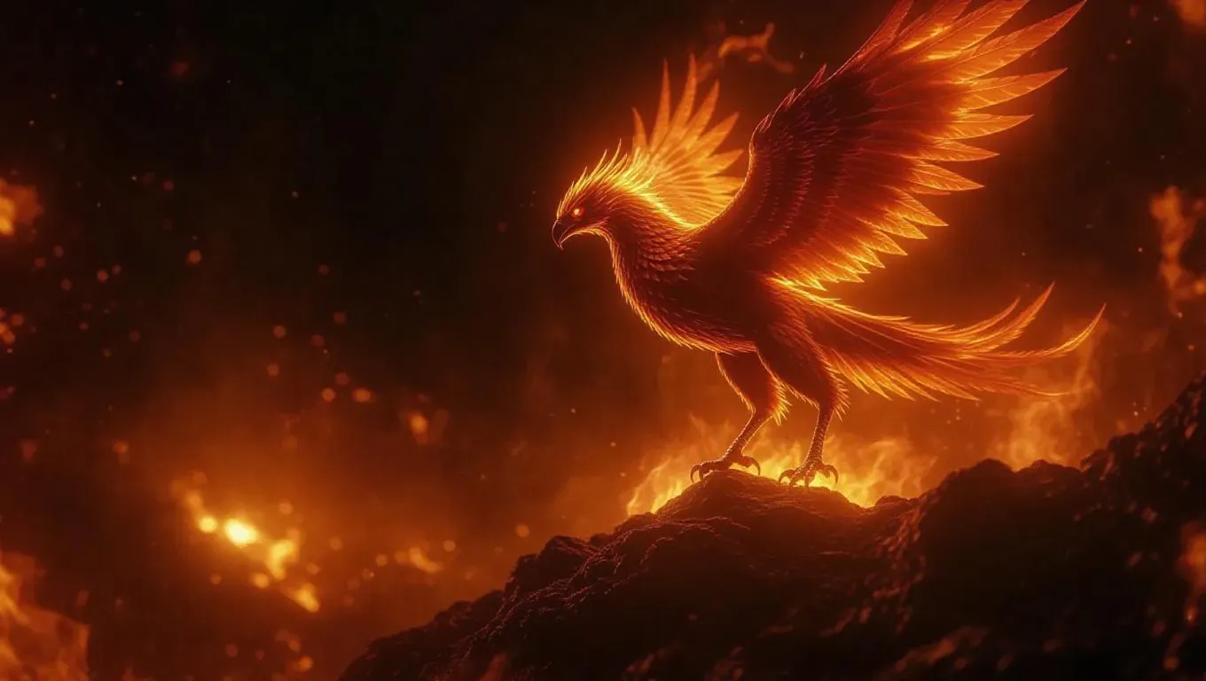 A fierce fire phoenix, his body formed from shimmering blaze, hovering over a hill of fiery remains, flames soaring into the abyss, ultra-detailed, dark fantasy