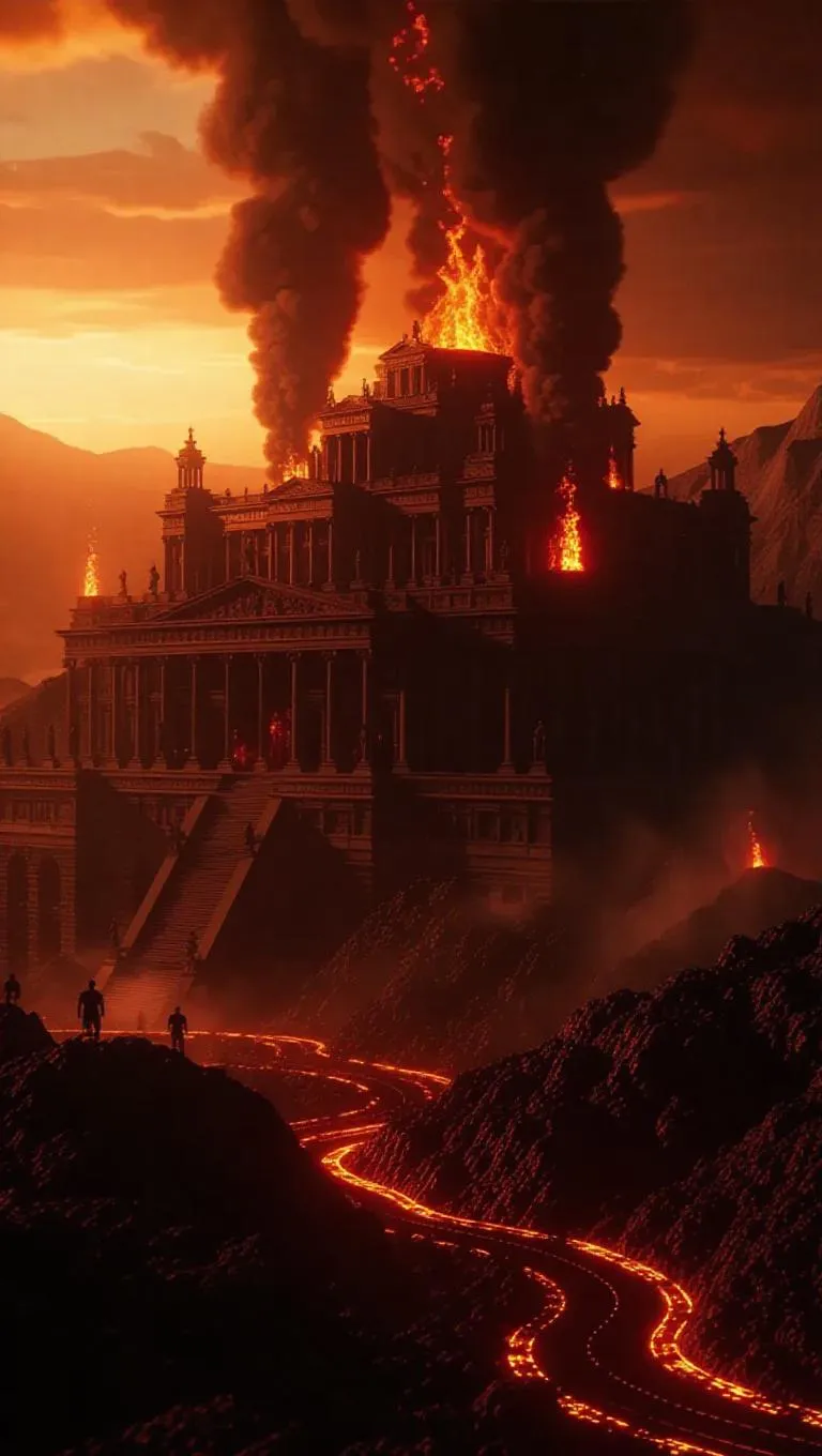 AI archaeologists analyzing Atlantis through volcanic ash visuals, each eruption encapsulating the city's downfall in liquid flames. Lidar-derived structures infused with fantasy art flames.
