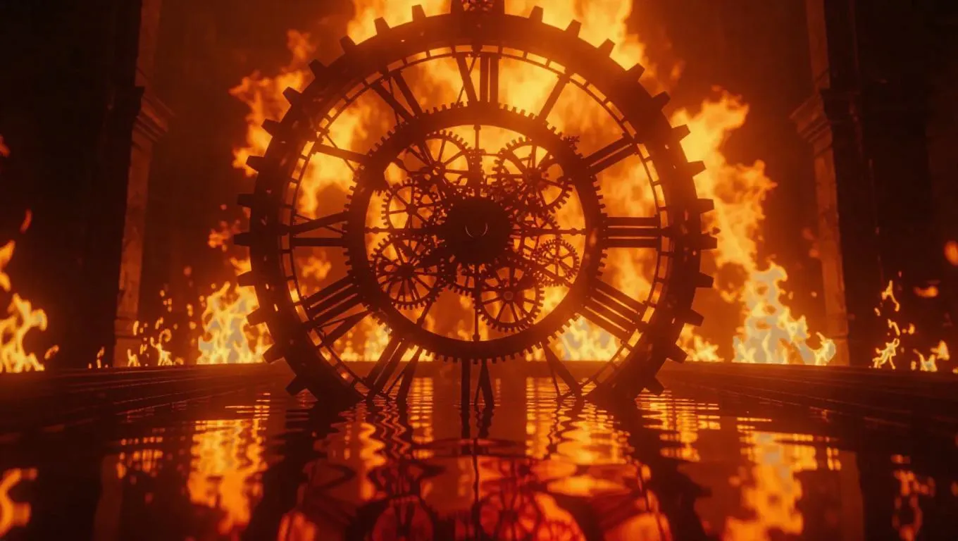 A colossal ancient clock tower reflected in a pool of roaring fire, gears and cogs melting, naturalistic aesthetics, dramatic lighting, ultra-detailed.