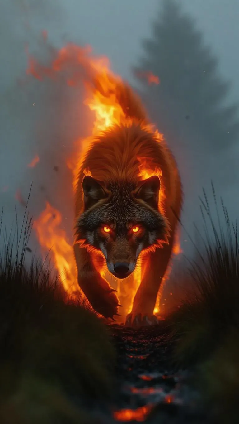 A fire beast prowls through a foggy moor, its body covered in flames, the fire reflecting in its glowing eyes, as it moves with predatory grace, leaving a trail of destruction in its wake