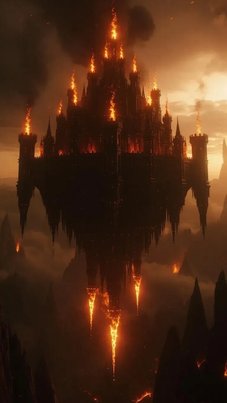 A colossal floating fortress crafted from flames, its spires resembling chaotic firestorms, hovering over a realm of smoldering ashes, epic fantasy, high detail, ultra-HD