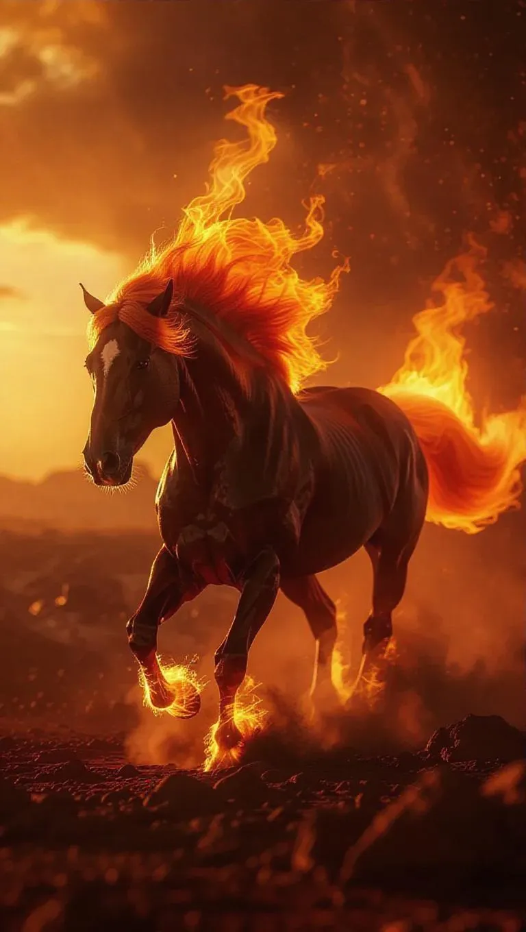 A brave fire horse exploring an alien terrain, its mane and tail blazing with supernatural flames, dramatic fantasy illustration, highly detailed