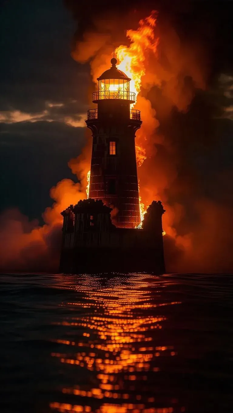 a lighthouse engulfed in flames, firelight reflecting on its coastal surface as it slowly succumbs, the structure collapsing in on itself with intense heat and smoke.